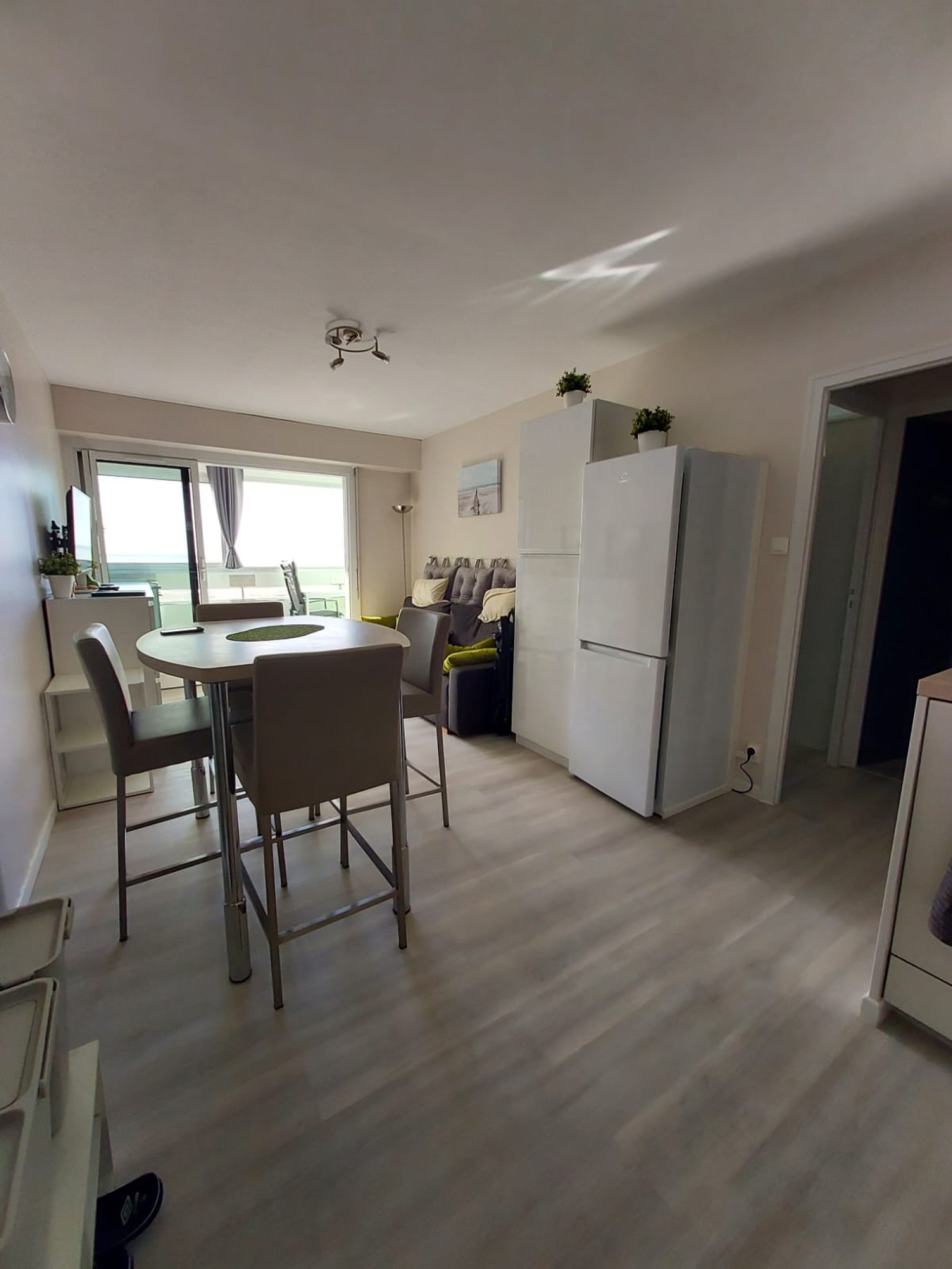 Il se compose d'une entrée, une cuisine neuve aménagée et équipée donnant sur une salle à manger, dégagement, une chambre, salle d'eau, wc.